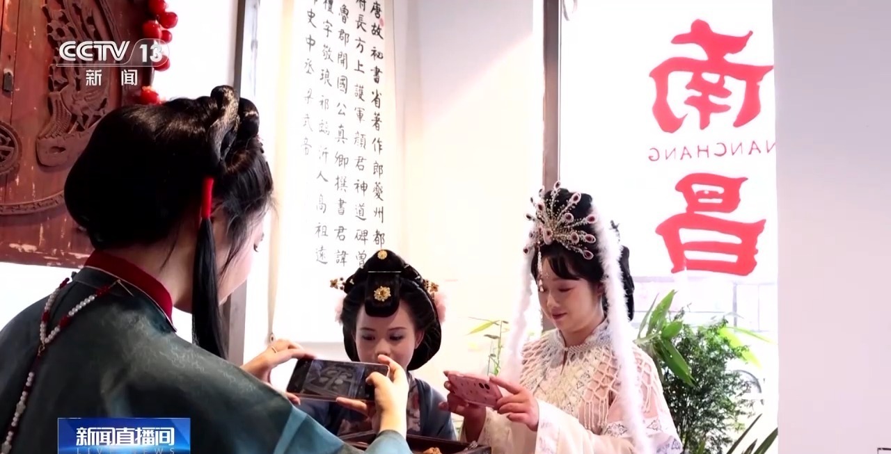 在江西南昌的绳金塔历史文化街区,身着汉服的年轻人举着国风包装的蛋黄麻花拍照打卡,而背后是南昌市具有百年历史的中华老字号品牌“品香斋”,传统与潮流在这一刻交融。